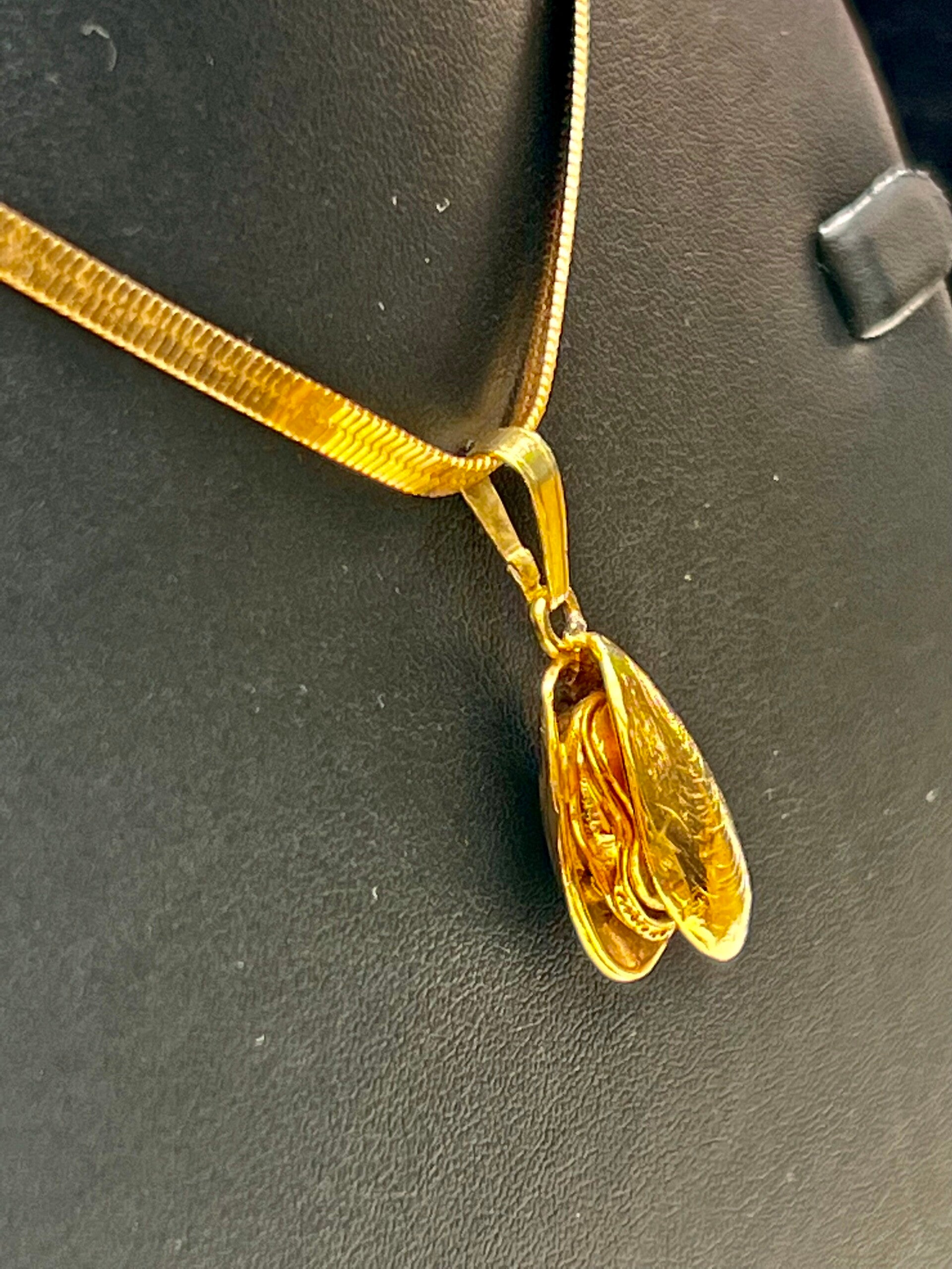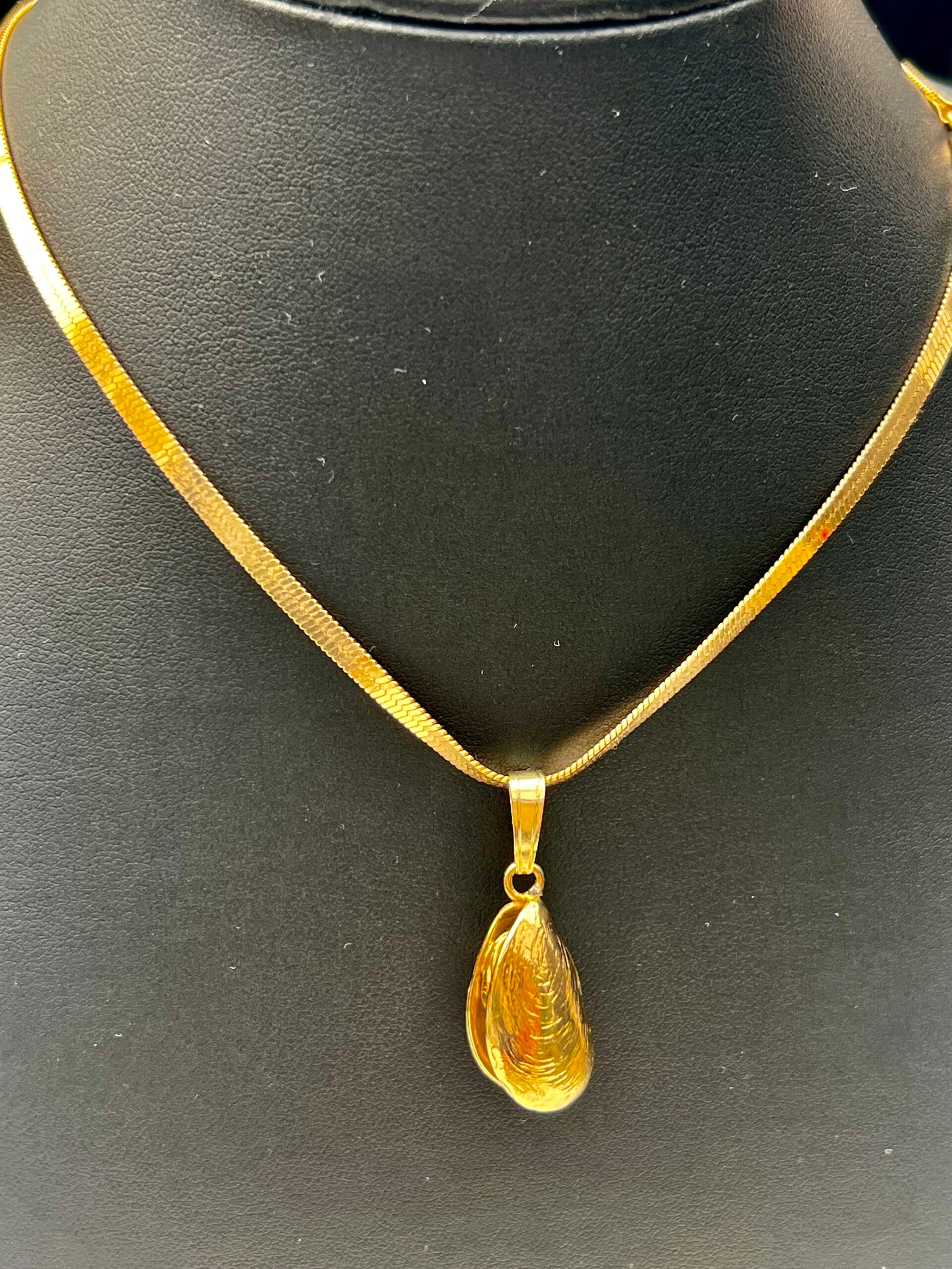 Mossel ketting hanger 14k goud: 585 Sterling . Afmeting h x b x d : ca. 22 x 12 mm. Soort Hanger massief afbeelding : 3D Gewicht : 7 gram .Deze afgewerkte 14k goud Mossel ketting hanger wordt geleverd in een gratis cadeau verpakking.